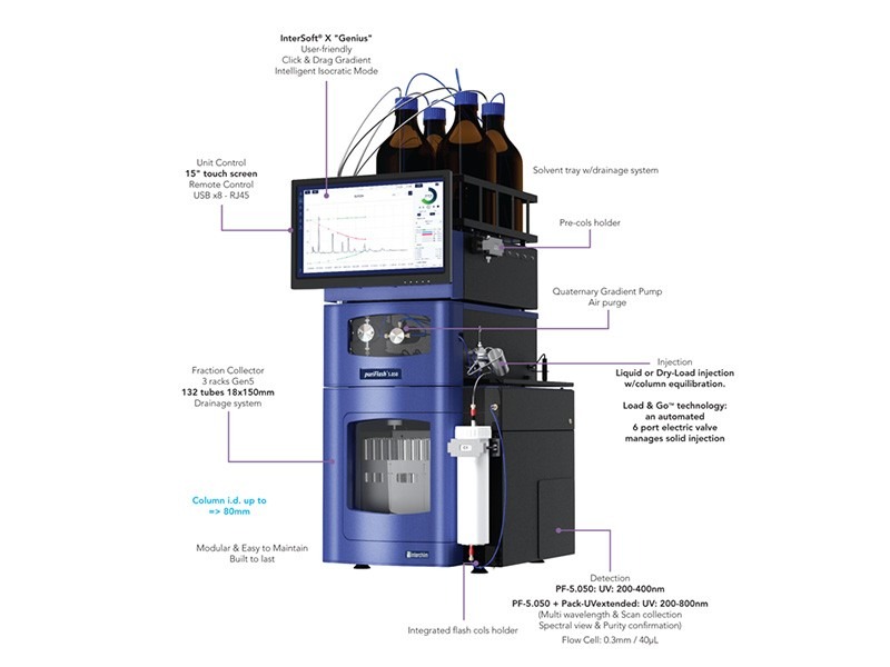 PuriFlash® 5.050, ELSD, UV ve diğer dedektörlerle donatılmıştır ve minimal alan kaplar. RFID teknolojisi sayesinde kolonlar, raflar ve enjeksiyon döngüleri gibi bileşenler otomatik olarak yöntemlerinize eklenir.